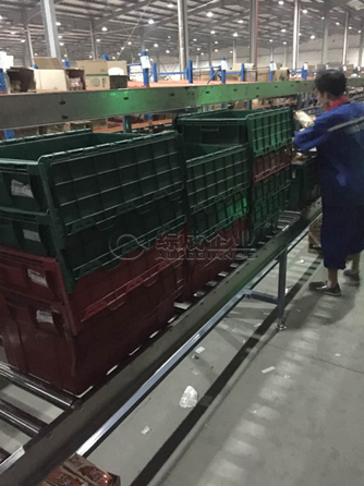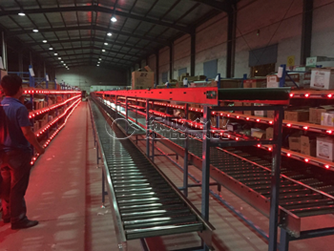 拆零部分:對(duì)于便利店來說拆零是大的揀貨工作量。該區(qū)域共設(shè)計(jì)四個(gè)作業(yè)大區(qū)12個(gè)作業(yè)小區(qū),目前只有八個(gè)作業(yè)人員。系統(tǒng)設(shè)計(jì)為區(qū)域聯(lián)動(dòng)接力式揀貨,采用流利式貨架作為貨物擺放載體配合兩條無動(dòng)力作業(yè)線一條動(dòng)力作業(yè)線及一條空箱回收線(皮帶輸送機(jī))。同時(shí),該方案中提供了緊急補(bǔ)貨提醒功能,使補(bǔ)貨作業(yè)更為迅速。
